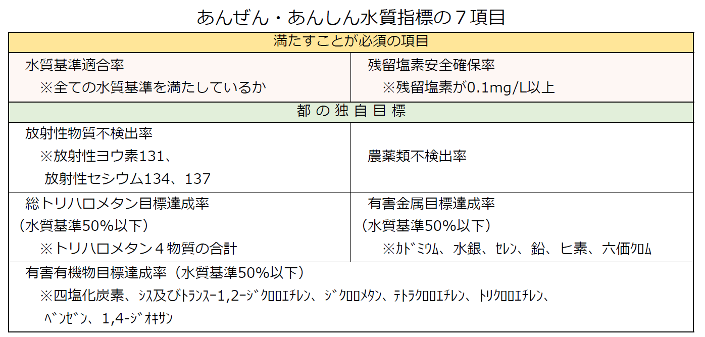 回答; 水道局では、水道水の高い安全性をお客さまにご理解いただき、安心して水道水をご使用いただくため、「あんぜん・あんしん水質指標」を定めました。