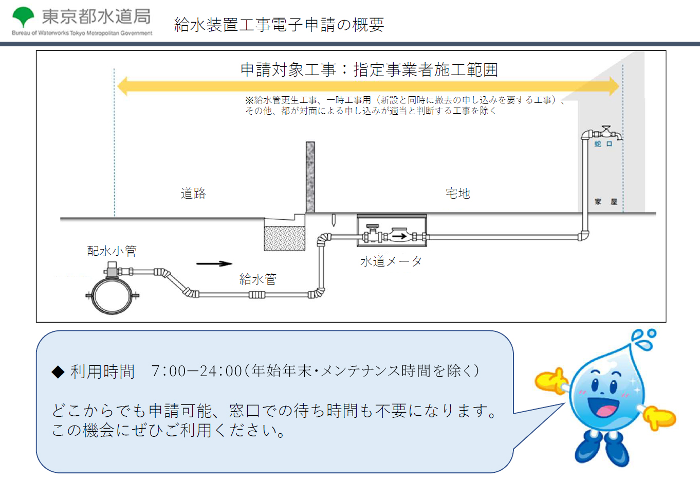 東京都水道局では、指定事業者の方を対象に、給水装置工事電子申請を導入しております。