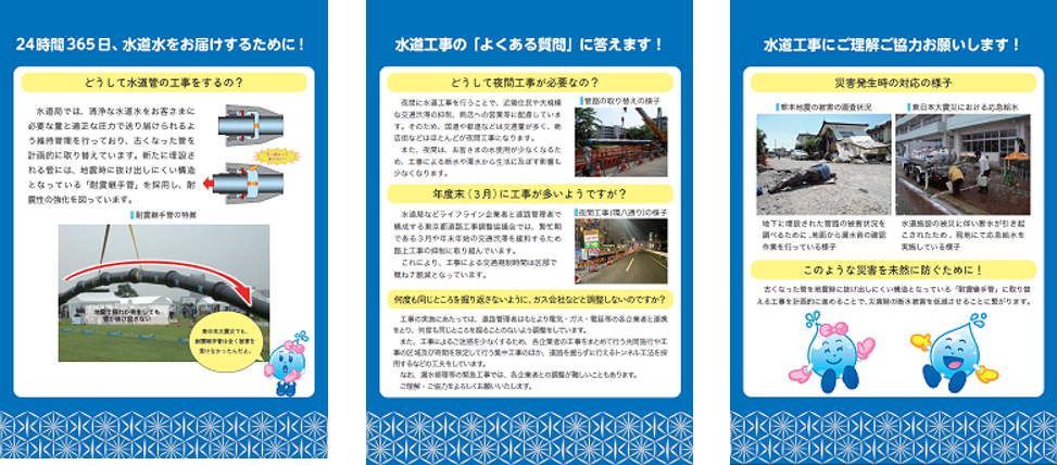 水道工事の取組や意義を広い視点でPRするため、工事の目的とともに、耐震継手管の特徴や災害発生時の対応の様子などをわかりやすく説明したパネルを作成し、諸イベントで掲出した。また、水道工事を行う職員等に着目した動画を作成し、局ホームページやX(旧:Twitter)、Youtube、電車内ビジョン等に掲出した。