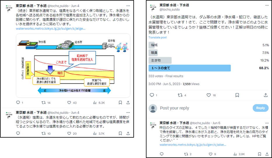 X(旧Twitter)にて、当局の水質管理の取組や残留塩素低減化の取組について、クイズも交えながら分かりやすくお知らせした。