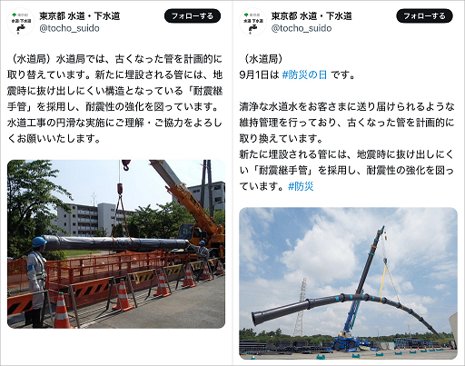 古くなった管を計画的に取替え、新しい管は地震時に抜け出しにくい「耐震継手管」を採用して、耐震性の強化を図っていることをX(旧Twitter)に投稿した。引き続き、様々な機会にPRしていく。