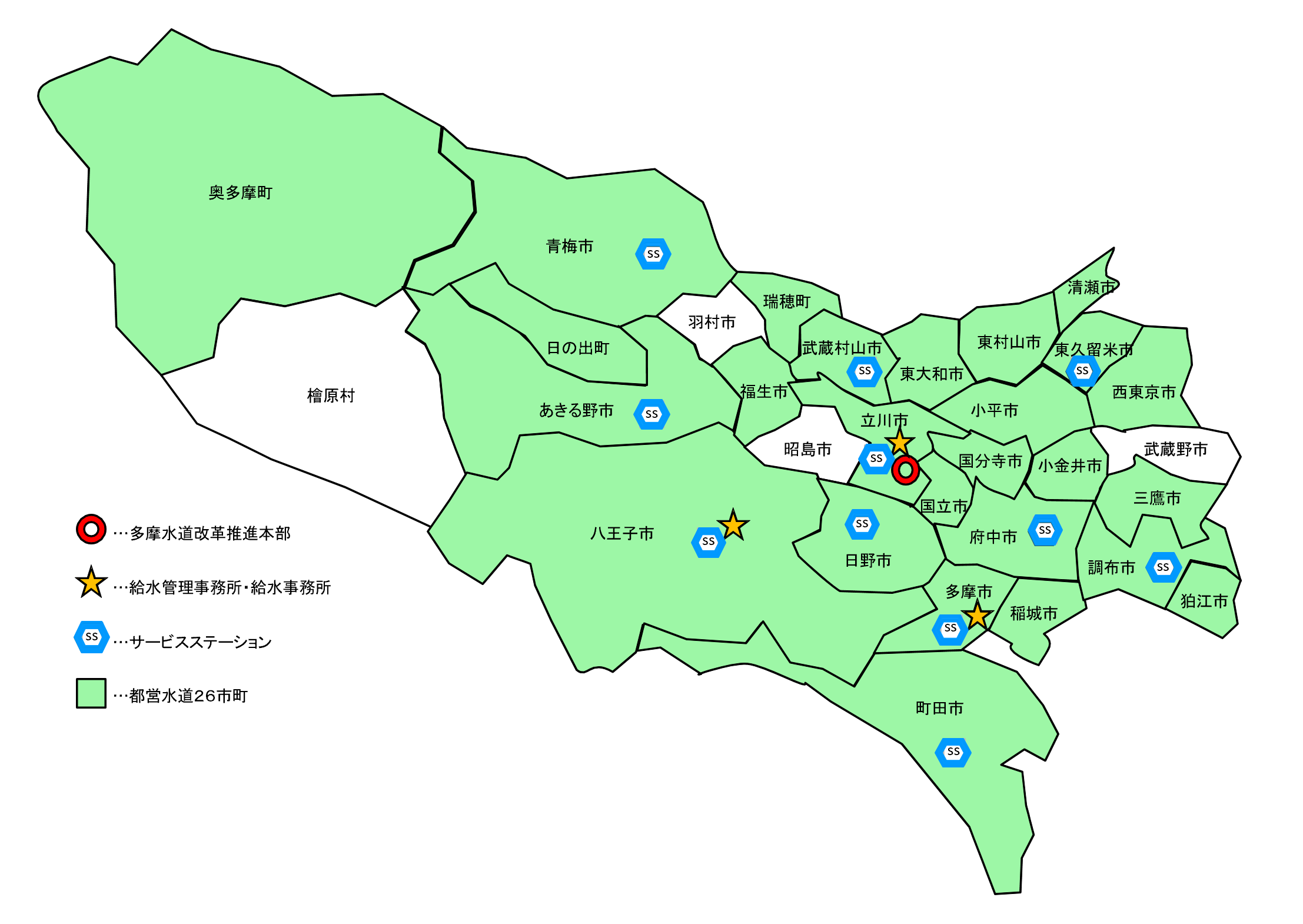 東京都水道局では、多摩水道改革推進本部の下、施設管理等の拠点として、給水管理事務所及び給水事務所を設置するとともに、お客さま対応窓口として、水道料金の収納や給水工事の審査等の業務を行うサービスステーションを開設して、多摩地区水道の業務運営を効率的に行っています(下図参照)。