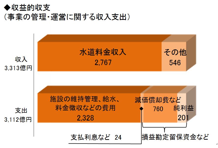 - 収益的収支については、収入3,313億円、支出3,112億円となり、純利益は、201億円となりました。