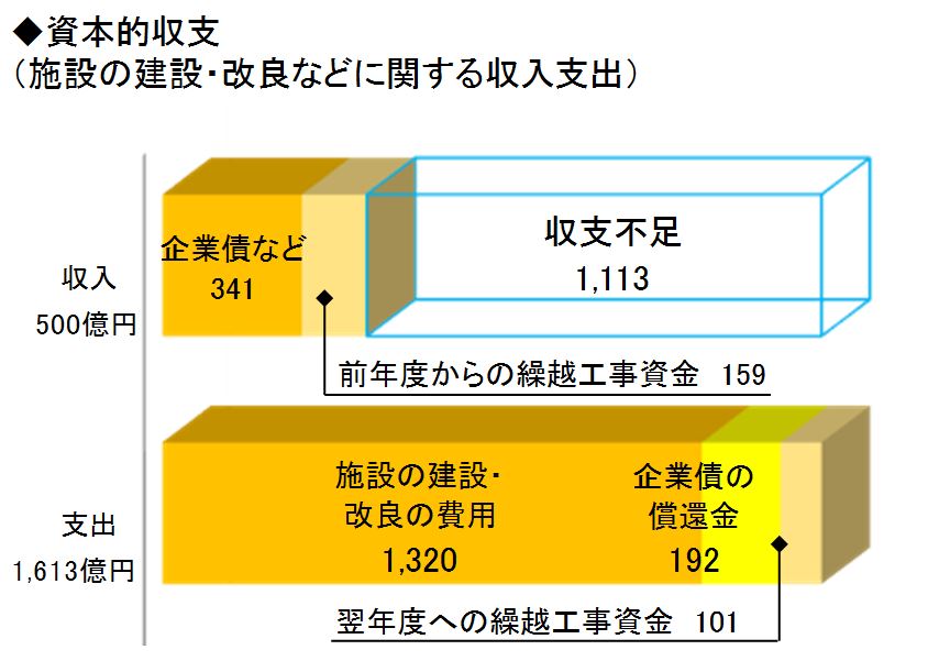 - 資本的収支については、収入500億円、支出1,613億円となり、1,113億円の収支不足が生じました。