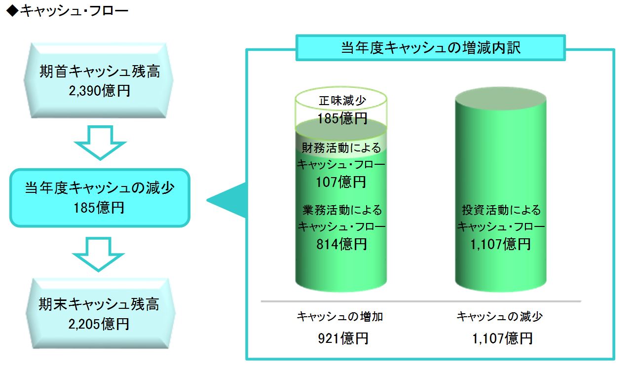 令和4年度は、業務活動で814億円、財務活動で107億円のキャッシュを生み出し、投資活動で1,107億円のキャッシュを使用した結果、単年度で185億円のキャッシュが減少し、令和4年度末のキャッシュ残高は、2,205億円となりました。