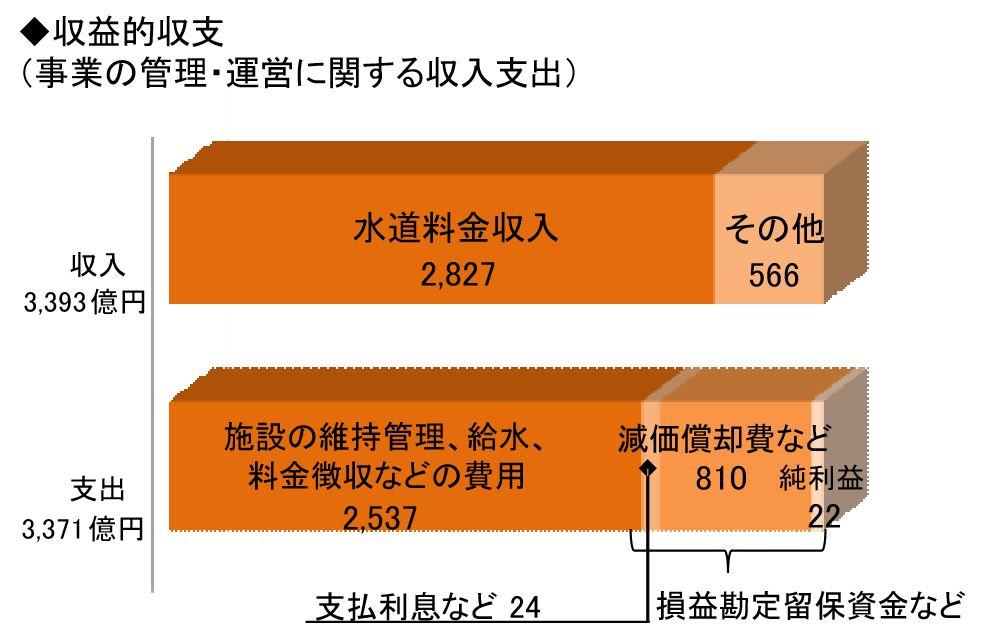 - 収益的収支については、収入3,393億円、支出3,371億円となり、純利益は、22億円となりました。