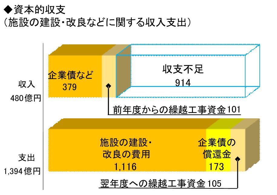 - 資本的収支については、収入480億円、支出1,394億円となり、914億円の収支不足が生じました。