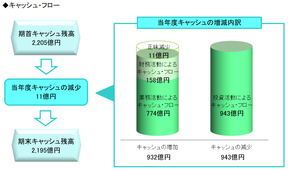 令和5年度は、業務活動で774億円、財務活動で158億円のキャッシュを生み出し、投資活動で943億円のキャッシュを使用した結果、単年度で11億円のキャッシュが減少し、令和5年度末のキャッシュ残高は、2,195億円となりました。