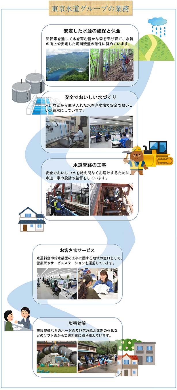 東京都水道局が策定する方針・計画を基に、水道局と東京水道株式会社が「東京水道グループ」として、ともに東京の水道事業を支えています。