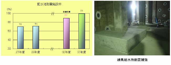 | 計画 災害時にも安定給水を確保するため、配水池の耐震化を計画的に実施 H26(耐震化率)70% H32(目標)89% H37(目標)99% ※区部多摩計 練馬給水所、有明給水所等にて配水池の耐震強化を推進 鑓水小山給水所、大船給水所、散田給水所等の調査・設計及び整備を実施 |