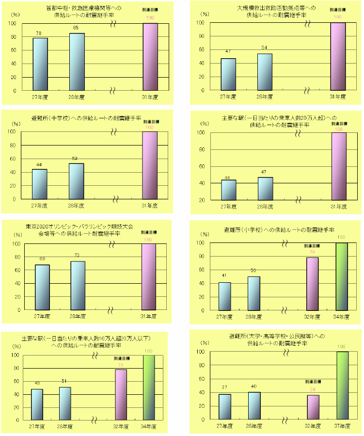実績 重要施設への供給ルートの耐震継手化率 (平成28年度末) 〇首都中枢・救急医療機関等 85% 〇大規模救出救助活動拠点等 54% 〇避難所(中学校) 53% 〇主要な駅(乗車人数 20万人超/日) 47% 〇東京2020オリンピック・パラリンピック 競技大会会場等 73% ●避難所(小学校) 50% ●主要な駅(乗車人数 10万人超/日) 51% ★避難所(大学・高等学校・公民館等) 40% |