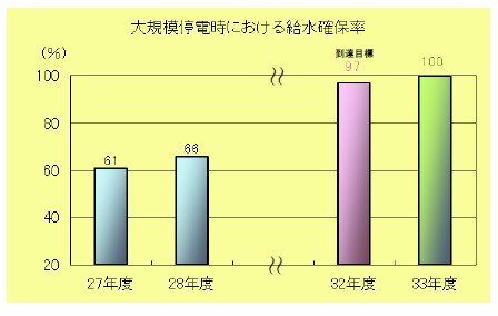 | 評価 ・対象年度の検証 平成28年度完成した非常用発電設備により、大規模停電時の給水確保率が66%に上昇しました。 計画どおり日野増圧ポンプ所等について自家用発電設備の新設・増強を完了し、震災時の安定給水性が向上しました。 三郷浄水場においても、常用自家発電設備設置の設計を計画どおり進めています。 ・目標の達成に向けた主な課題 三郷浄水場の常用自家発電設備設置は、関連する建屋工事との工程調整等が必要ですが、概ね計画どおり工事を進めており、特段の課題はありません。 大規模停電時における給水確保率の向上のため、事業費を確保して着実に設計・施工を進める必要があります。 施工に当たっては、既存の施設・設備への影響を考慮し、通常の運用に支障がないようにすることが必要です。 ・目標の達成に向けた今後の方向性 大規模停電時でも浄水場の施設能力を100%発揮するため、関連する建屋工事の工事進捗に合わせ、計画的な工事発注などを行い、事業を着実に進めていきます。 今後とも、大規模停電の際に、断水や濁水が発生しないように、計画的に自家用発電設備の新設・増強を進めていきます。 この取組によって、電力事情に左右されない電力の自立化が図られ、電力の安定的な確保が可能になります。 |