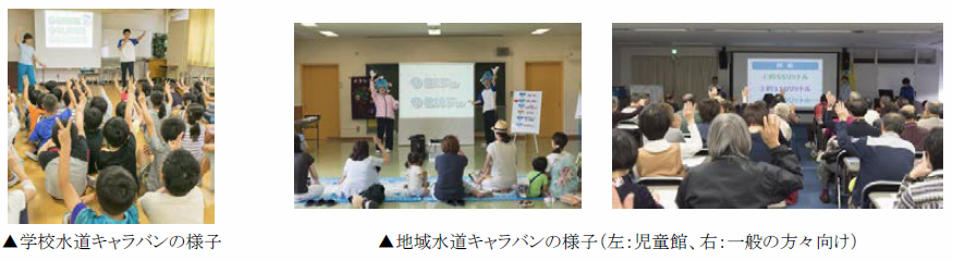 実績 学校水道キャラバン : 1,273校 都営水道給水区域内の小学4年生を対象に、東京水道への理解(「水道水のおいしさ」「安全性」「大切さ」など)を深めてもらうため、希望する小学校へキャラバン隊による訪問授業を実施 地域水道キャラバン : 219回 学校水道キャラバンのノウハウを活かし、乳幼児を子育て中の保護者を主な対象とした地域水道キャラバンを児童館等で209回実施 また、更に対象を拡大し、一般の方々向けの地域水道キャラバンを局PR館や区市町主催の講座、イベント等で10回試行 |