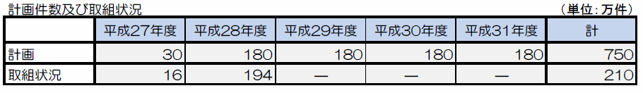 | 計画 平成31年度までに給水区域内の全戸(大規模使用者、公共施設等を除く)を訪問 平成28年度累計:210万件 |