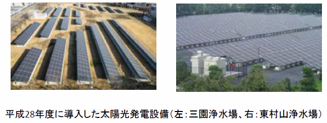 | 計画 代替浄水施設整備に伴う位置エネルギーの活用 太陽光発電の導入 (平成32年度までに累計8,000kW以上) 小水力発電の導入 (平成31年度までに累計2,300kW以上) コージェネレーションシステムの導入(三郷浄水場) |