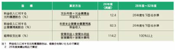 | 評価 ・対象年度の検証 料金収入に対する元利償還割合 これまで計画的に企業債残高の圧縮に努めてきた結果、企業債の元利償還額は約257億円で前年度に対して約46億円減少しました。この結果、事業目標数値に対する達成率は133%となりました。 料金収入に対する企業債残高割合 料金収入に占める企業債残高割合は、企業債の償還が進んだことにより、前年度の74.6%から72.0%と前年度実績に対して約2.6ポイント減少し、事業目標数値に対する達成率は113%となりました。 経常収支比率 経常収益は、給水収益などが増加したため、前年度実績に対して約24億円増加しました。 また、経常費用は配水費の増加などにより、前年度実績に対して約42億円増加しました。この結果、経常収支比率は前年度の113.1%から112.3%と0.8ポイント減少しましたが、財政状況がおおむね良好な状況とされる100%を上回っています。この結果、事業目標数値に対する達成率は112%となりました。 ・目標の達成に向けた今後の方向性 企業債残高の増嵩には十分留意をしながら、企業債を適切な規模で発行し、将来の更新需要の財源に活用していきます。 この企業債の活用に当たっては、中長期的な視点に立って、整備した施設は現役世代だけではなくて次世代、次の世代に受け継がれる、こういった視点を踏まえて、世代間の負担の公平性に十分配慮することが極めて重要です。 今後とも企業債の適切な活用などにより、持続可能な水道事業の運営のための財源の確保に努めていきます。 |