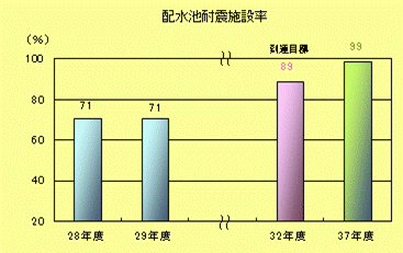 | 計画 災害時にも安定給水を確保するため、配水池の耐震化を計画的に実施 到達目標 配水池耐震施設率 : 89%(平成32年度) |
