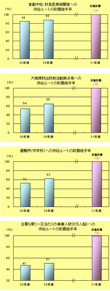 実績 重要施設への供給ルートの耐震継手化率 (平成29年度末) ○首都中枢・救急医療機関等 : 88% ○大規模救出救助活動拠点等 : 65% ○避難所(中学校) : 63% ○主要な駅(乗車人数 20万人超/日) : 51% ○東京2020オリンピック・パラリンピック 競技大会会場等 : 82% ●避難所(小学校) : 58% ●主要な駅(乗車人数 10万人超/日) : 59% ★避難所(大学・高等学校・公民館等) : 46% |