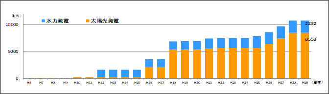 | 計画 代替浄水施設整備に伴う位置エネルギーの活用 太陽光発電の導入 (平成32年度までに累計8,000kW以上) 小水力発電の導入 (平成31年度までに累計2,300kW以上) コージェネレーションシステムの導入(三郷浄水場) |