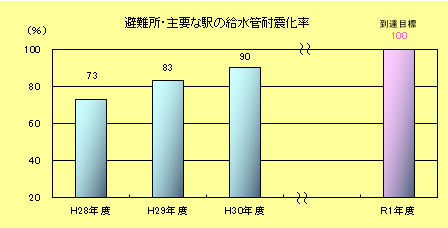 | 計画 避難所・主要な駅の配水管から水道メータまでの給水管を耐震化 到達目標 避難所等給水管の耐震化率 : 100%(令和元年度) |