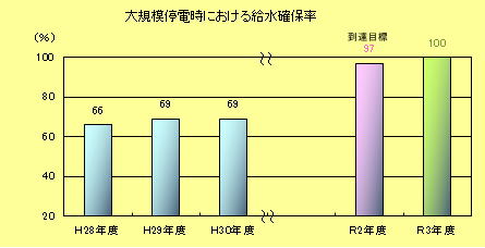| 計画 大規模停電時でも、浄水場は施設能力を100%発揮できるよう、給水所などは平常時と同様に稼働できるよう、自家用発電設備を新設・増強 到達目標 大規模停電時の給水確保率 : 97%(令和2年度) |