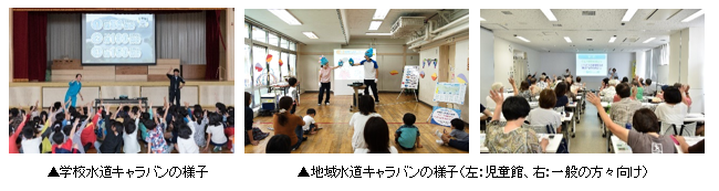 | 計画 学校水道キャラバン 都営水道給水区域内の小学4年生を対象に、東京水道への理解(「水道水のおいしさ」「安全性」「大切さ」など)を深めてもらうため、希望する小学校へキャラバン隊による訪問授業を実施 地域水道キャラバン 学校水道キャラバンのノウハウを活かし、乳幼児を子育て中の保護者を主な対象とした地域水道キャラバンを児童館等で実施 また、対象を拡大し、一般の方々向けの地域水道キャラバンを局PR館や区市町主催の講座、イベント等で実施 実施目標 学校水道キャラバン : 1,200校 地域水道キャラバン : 180回 |