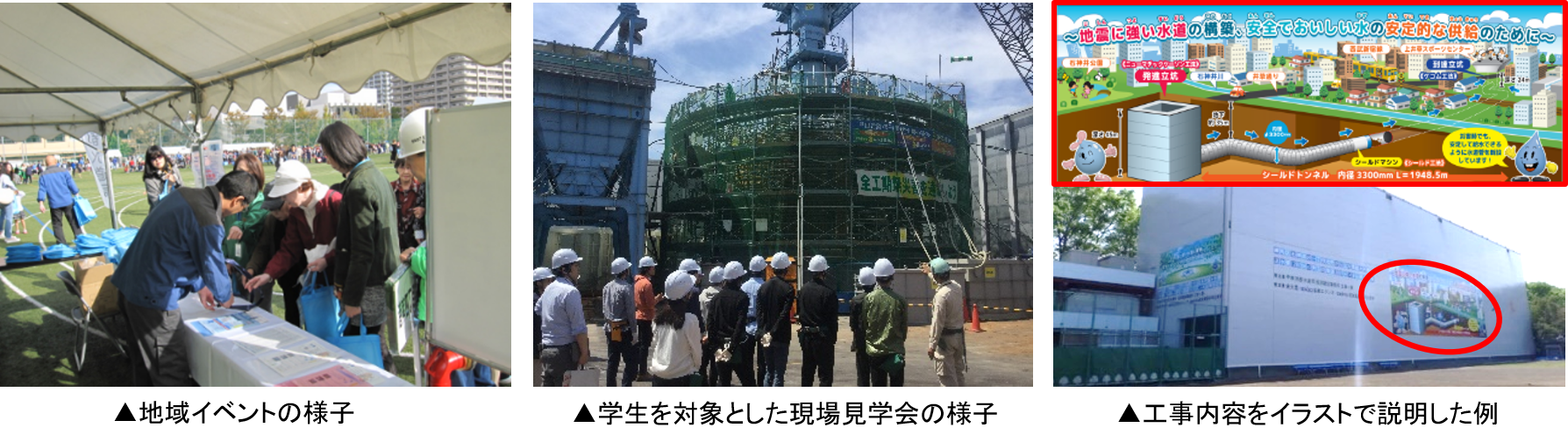 | 評価 ・地域イベントでのPRブースの出展及び地域別広報紙(地域水道ニュース)の配布 「水道なんでも相談」等のイベントにおいて、東京の水道に関するクイズや、水道水とミネラルウォーターの飲み比べアンケートを実施した。これにより、水道水の安全性やおいしさについて多くの方とコミュニケーションを図ることができ、相互理解が促進されました。 また、地域の災害時給水ステーションや局事業のPRが記載されたパネルの設置、地域別の広報誌を配布するなどの取組を行ったことで、水道事業への理解や親しみをより一層認識していただくことができました。 さらに、水道水とミネラルウォーターの飲み比べや、Tokyowater Drinking Station(東京国際フォーラムなど、公共性の高い場所に設置されている水飲栓やイベントの際に設置する可動型の水飲栓)を活用した東京水の試飲などを実施し、多くのお客さまに水道水のおいしさを実感していただくことができました。 「地域水道ニュース」については、あんしん診断やIWA世界会議など、局の取組について周知の強化を図るため適時適切に広報しました。 ・工事現場における見学会の実施や広報看板の設置など 工事現場周辺にお住まいのお客様や学生等を対象とした現場見学会や地域イベントなどを実施し、地域の皆様と直接触れ合うことで、水道を身近に感じていただくことができました。 また 多くのお客さまに水道工事への信頼と親しみを深めていただくため、工事内容をイラストで分かりやすく説明した広報看板の設置や、工事のお知らせビラの裏面に水道の仕組みや安全でおいしい高品質な水をお届けするための取組等を記載することで広報を行いました。 多様な地域広報を展開するため、受注者に水道工事におけるイメージアップ事例集を配布し、計画的で効果的な地域に即した取組を着実に進めてきました。 |