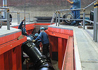 実際の現場を模した曲がりと段差のあるピット内で、大口径(500ミリメートル)の耐震管を接続(ひねり配管)する研修を行っています。