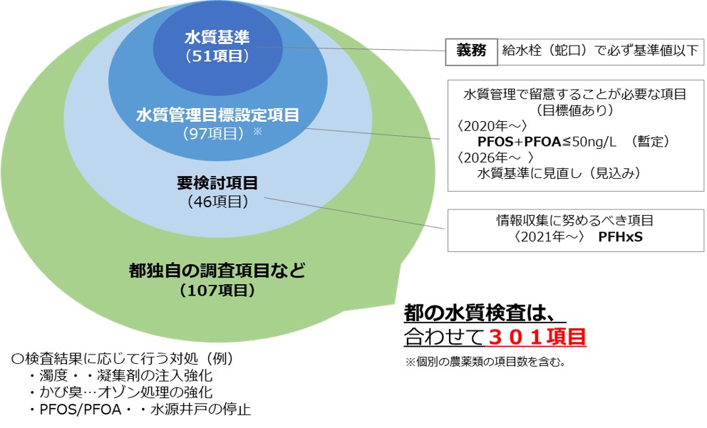 - 国の定める水質基準を大きく上回る301項目の検査、基準を守る早め早めの対応