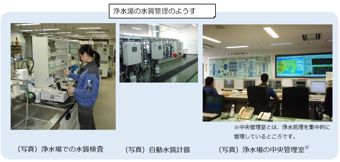 浄水場では、水道水の原料となる河川水などから、浄水処理の各工程の水、できあがった浄水(水道水)に至るまできめ細やかな水質検査をしています。