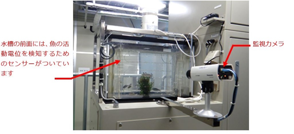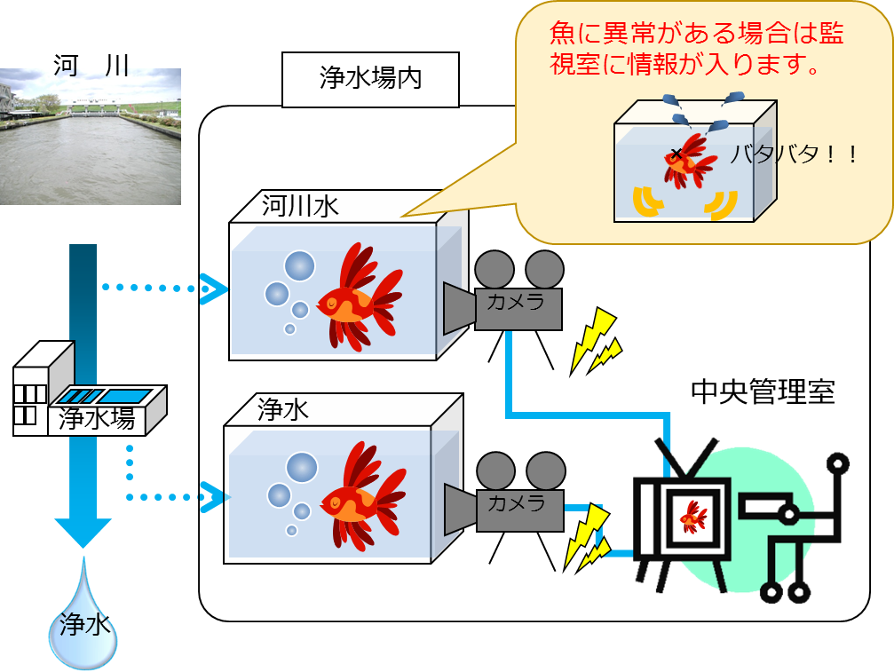 東京都水道局では、監視カメラによる目視と、魚が筋肉を動かすときの電気信号(活動電位)を測定することで、自動的に検知する方法を導入しています。