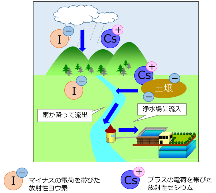 イオン形態のセシウムはプラスの電荷を帯びているため、マイナスの電荷を帯びた土壌の表面に吸着されやすく、水に溶け出しにくいという性質があります。